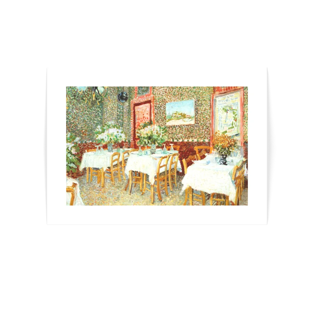 « Intérieur d'un restaurant » de Vincent van Gogh de 1887 est un exemple fascinant de sa capacité à transformer des scènes du quotidien en œuvres d'art vivantes. Le tableau montre un restaurant chaleureux avec des couleurs chaudes et invitantes et une composition dynamique. Van Gogh utilise des coups de pinceau audacieux pour souligner les textures des murs et des meubles, tandis que la disposition des tables et des chaises crée une atmosphère intime. L'éclairage subtil et l'attention particulière portée aux détails permettent presque au spectateur de ressentir l'arôme des aliments fraîchement préparés et le murmure silencieux des invités.