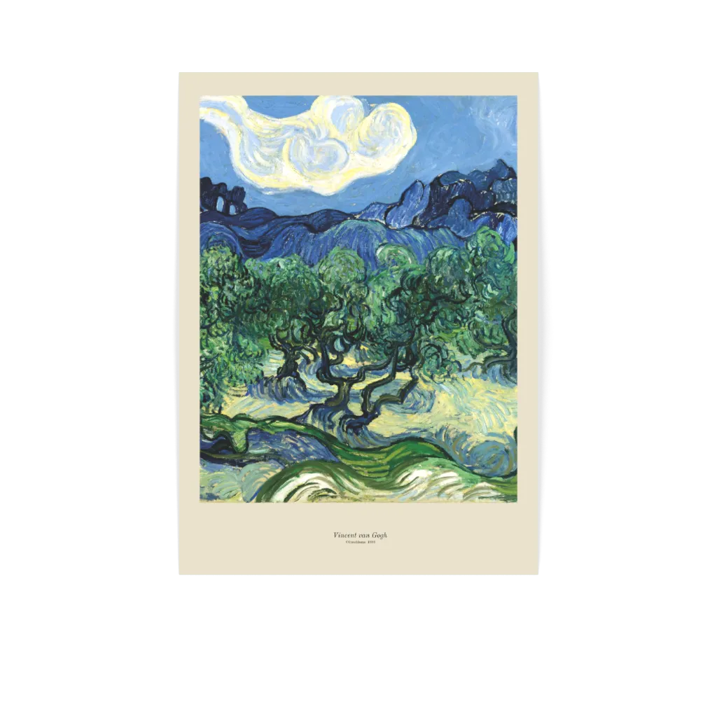 Lors de son séjour à l'asile Saint-Paul-de-Mausole à Saint-Rémy-de-Provence, où van Gogh fut interné volontairement en raison de ses problèmes de santé mentale, il réalisa certaines de ses œuvres les plus importantes, dont « Les Oliviers avec les Alpilles ». Malgré ses luttes intérieures, van Gogh a trouvé réconfort et refuge dans la peinture, ce qui rend ses œuvres de cette période particulièrement intenses et émotionnelles.
