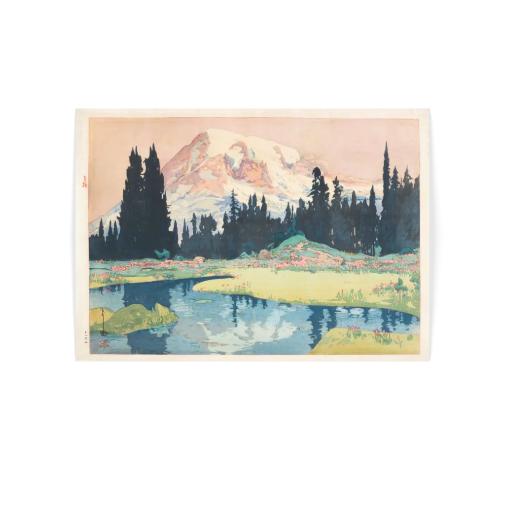 Hiroshi Yoshida, un maître de l'art de la gravure sur bois japonaise, a créé l'impressionnante œuvre « Mont Rainier » en 1925. Cette œuvre capture la beauté majestueuse du mont Rainier aux États-Unis et met en valeur l'extraordinaire capacité de Yoshida à utiliser la lumière et la couleur pour créer un calme presque méditatif. La palette de couleurs subtiles et les lignes précises reflètent l’essence de la nature et invitent le spectateur à s’immerger dans la grandeur silencieuse du paysage.