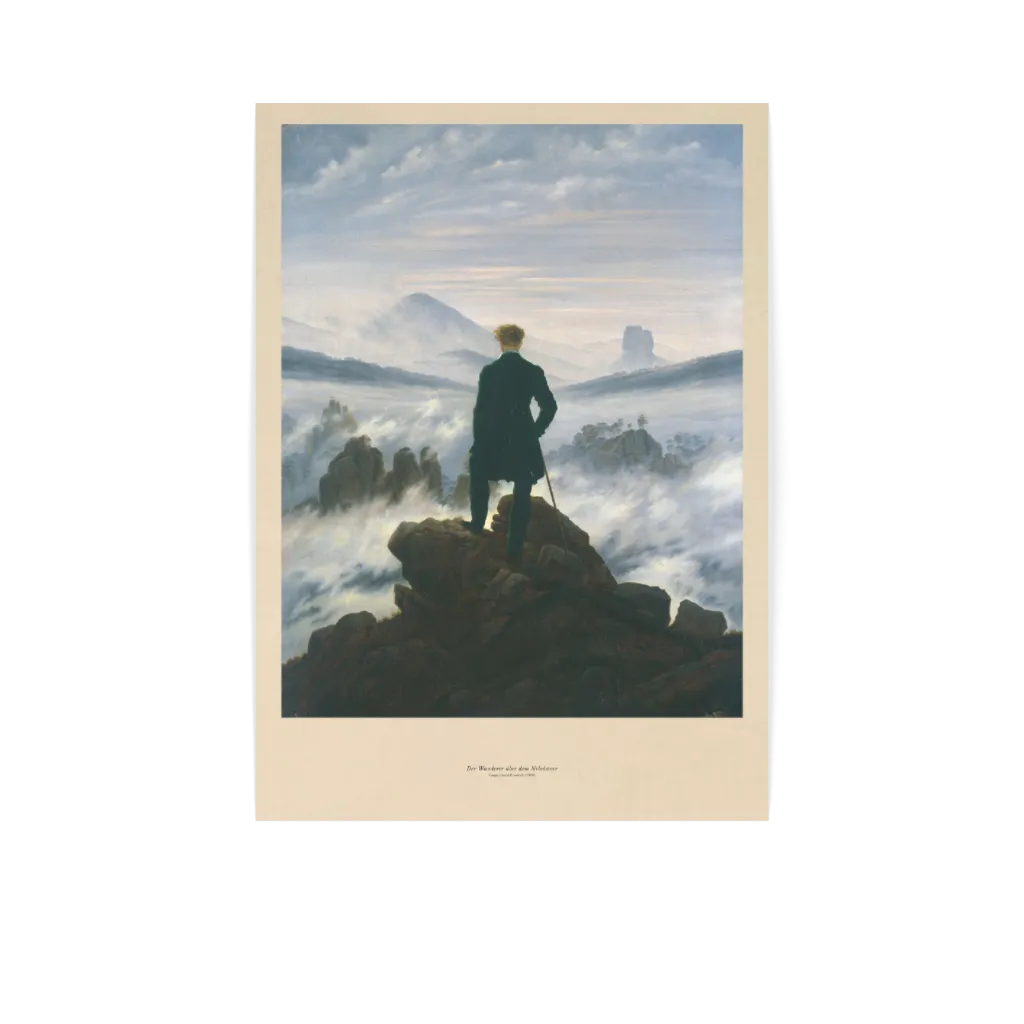 "Wanderer über dem Nebelmeer" è una delle opere più conosciute del pittore tedesco Caspar David Friedrich del 1818. Il dipinto mostra una figura di spalle – un viandante – che sta su una roccia e guarda un infinito mare di nebbia. La composizione gioca con l'idea del romanticismo, che enfatizza la maestosità della natura e l'esplorazione dell'anima umana. Il lavoro dettagliato di Friedrich e l'uso di luci e ombre conferiscono all'opera una qualità mistica, che invita lo spettatore a riflettere sulla propria esistenza e su quella del mondo che lo circonda.