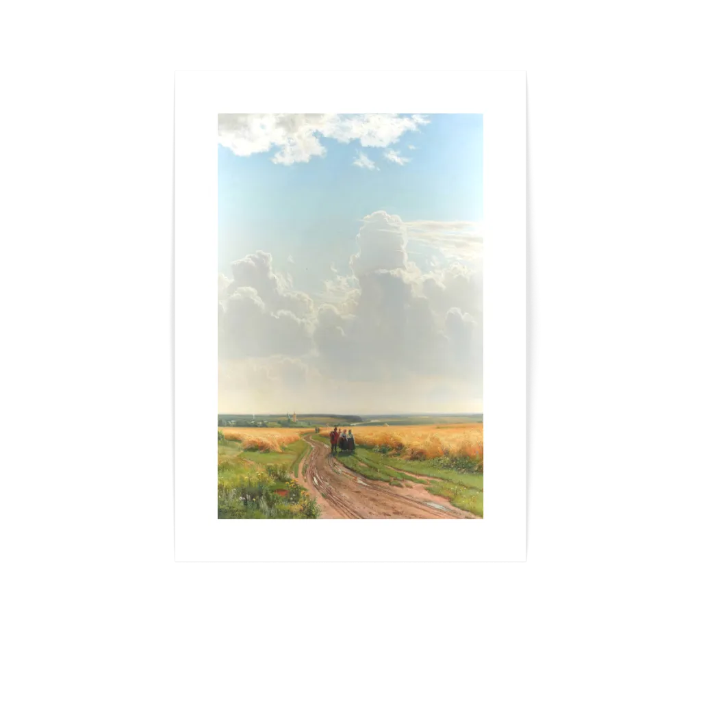 Midday by Ivan Ivanovich Shishkin is a masterpiece of Russian landscape painting that captures the silent majesty of nature in all its glory. Known for his meticulous attention to detail and ability to capture the essence of Russian forests, Shishkin depicts a sun-drenched forest scene in this work that transports the viewer to a world of calm and peace. The trees stand like silent sentinels as light gently filters through the canopy, creating a play of light and shadow on the forest floor. Shishkin's love of nature and his technical skill make this painting a timeless testament to his artistry.
