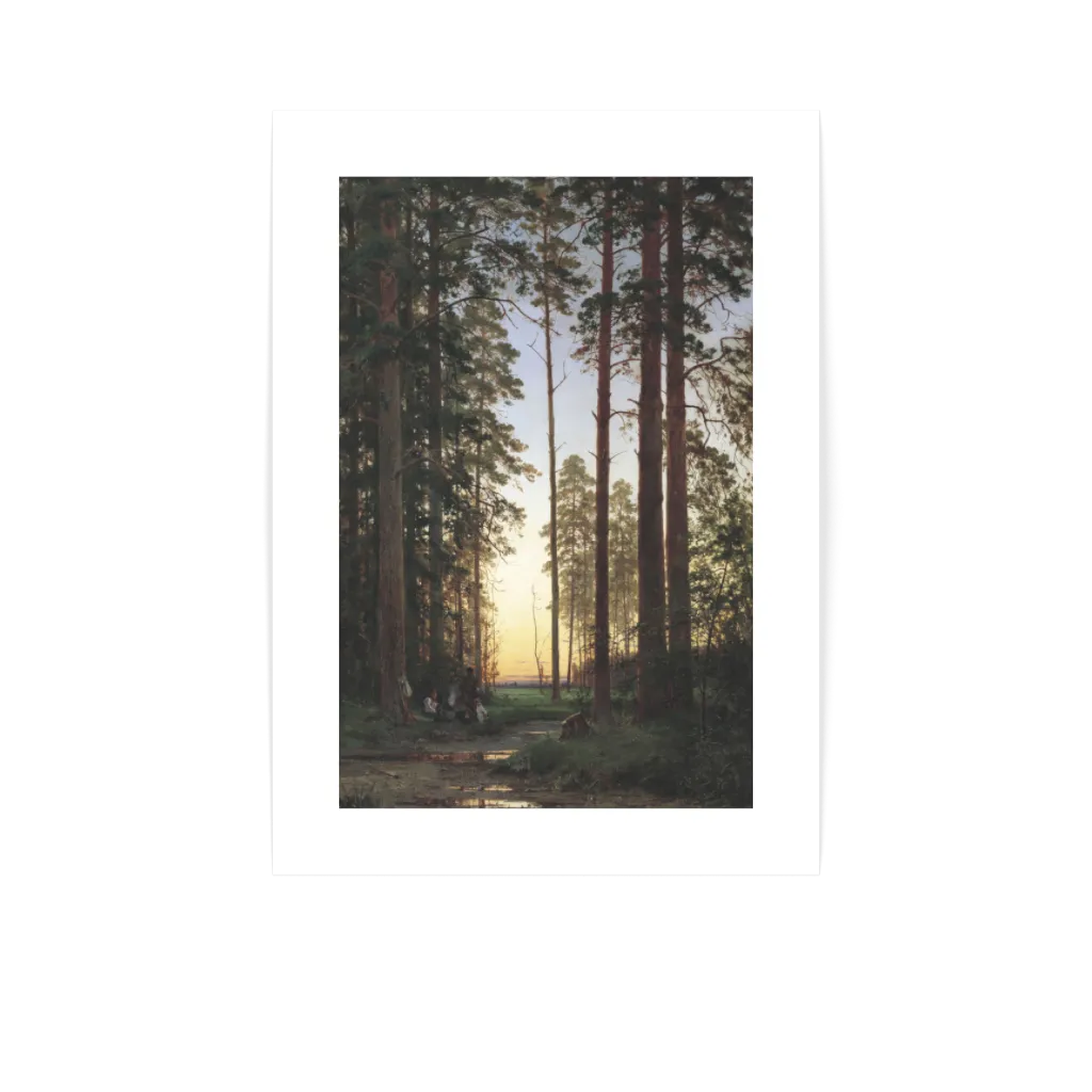 "On the Edge of the Forest" by Ivan Ivanovich Shishkin, painted in 1879, is a masterpiece of Russian landscape painting. Known for his meticulous attention to detail and love of nature, Shishkin captures the silent majesty of the forest in this work. The trees stand like silent sentinels at the edge of the forest, while the light gently filters through the canopy, bathing the ground in a warm, golden glow. The composition conveys a sense of calm and timeless beauty that transports the viewer to the pristine nature of Russia.