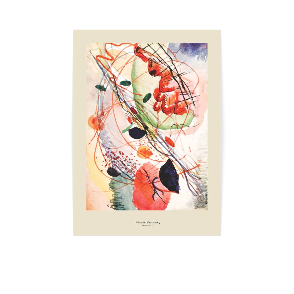 L'acquerello di Wassily Kandinsky del 1911 mostra una composizione dinamica di colori e forme, che segna l'inizio del suo periodo astratto. In quest'opera, Kandinsky si distacca dalla rappresentazione di oggetti reali e si concentra invece sull'effetto emotivo dei colori e delle linee. I colori vivaci e la disposizione libera e intuitiva delle forme riflettono la convinzione di Kandinsky che l'arte abbia la capacità di raggiungere ed esprimere i sentimenti più profondi dell'essere umano. Questo acquerello è un primo esempio dell'approccio sperimentale di Kandinsky al colore e alla forma, che lo ha reso uno dei pionieri dell'arte astratta.