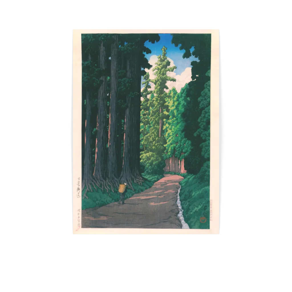 "Nikkō Kaidō" by Hasui Kawase, created in 1930, is a fascinating example of 20th century Japanese landscape printmaking. This work depicts a scene along the historic Nikkō Kaidō road, which was part of the ancient Edo period network connecting Nikkō to Edo (modern-day Tokyo). Kawase is known for his ability to capture the mood and atmosphere of the locations depicted, and in this print he masterfully manages to convey the tranquil and almost mystical quality of the landscape. The subtle color palette and fine details in the depiction of the trees and path invite the viewer to immerse themselves in the peaceful scene.