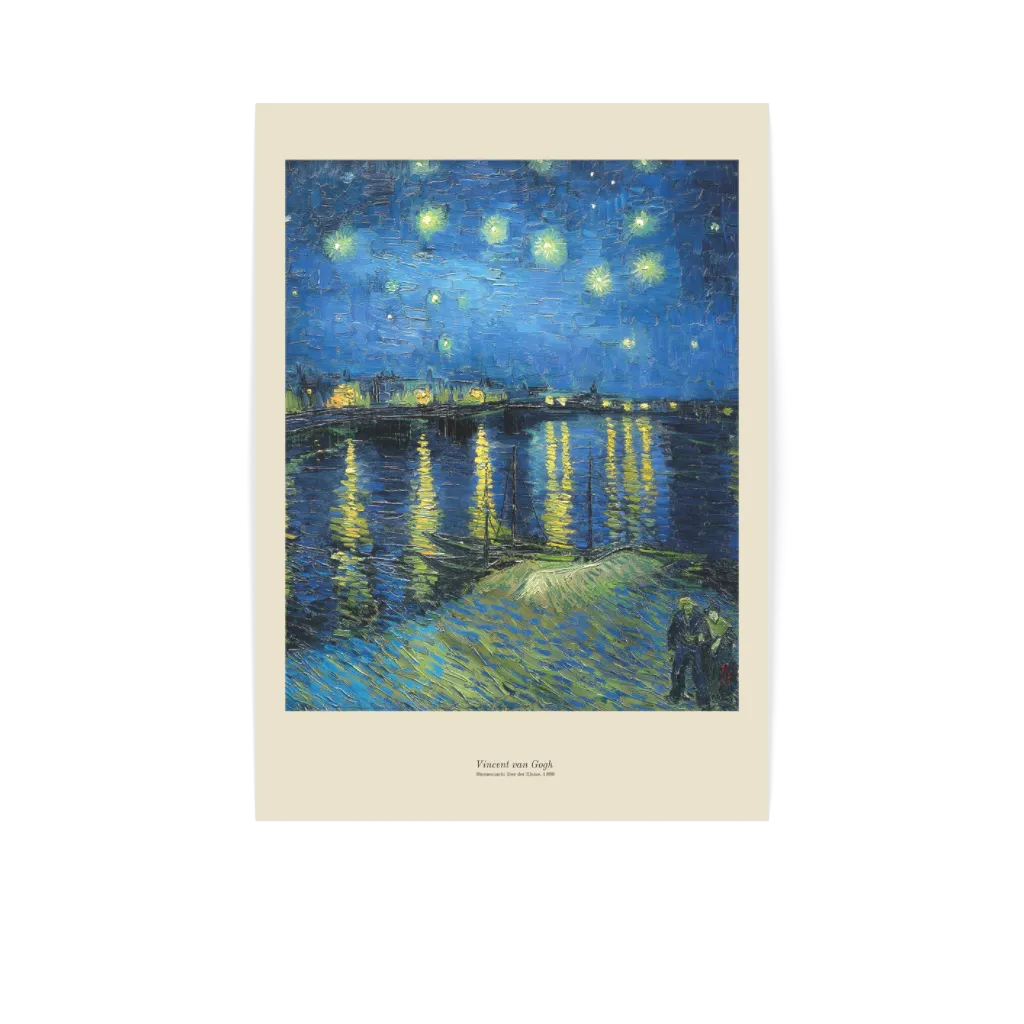 "Starry Night over the Rhone" is a mesmerizing painting by Vincent van Gogh, created in 1888. This artwork depicts a nighttime scene on the banks of the Rhone River in Arles, France, with twinkling stars reflected in the calm water. Van Gogh used vivid colors and dynamic brushstrokes to capture the movement of the water and the luminosity of the starry sky. The combination of natural beauty and urban lighting gives the painting a special atmosphere of calm and reflection.