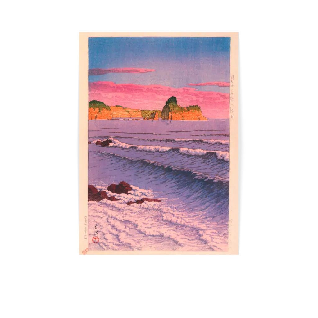 "Waves at Sunset" by Hasui Kawase, a prominent Japanese artist of the 20th century, is a mesmerizing work of art from 1933. This work depicts the tranquil yet powerful beauty of nature through the depiction of gently breaking waves under the picturesque glow of the sunset. Known for his ability to capture the mood and atmosphere of the scenes depicted, Kawase uses subtle color transitions and fine lines in this print to convey the fluid movement of the water and the last warmth of daylight. His works are a key example of the Shin-Hanga movement, which combined traditional Japanese woodblock printing techniques with Western elements of painting.